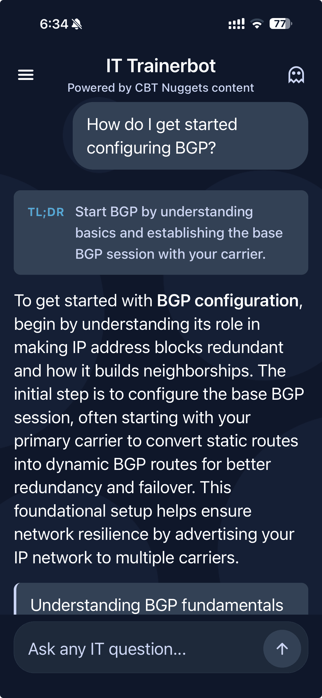 The same CBT Nuggets-powered answers your team gets in Slack, now available on iPhone. Perfect for on-the-go troubleshooting, studying for certifications, or quick reference in the field.