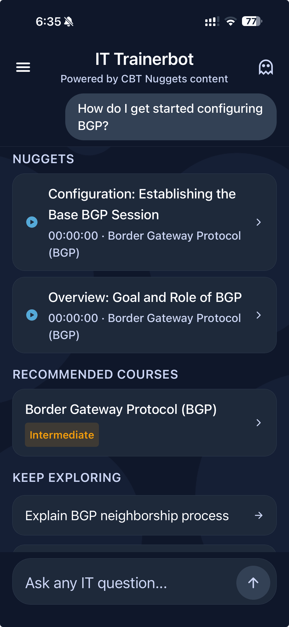 Trainerbot is your IT team's expert reference. Ask any IT question and get an answer grounded exclusively in the CBT Nuggets training catalog, with a timestamped link to the exact video where the topic is covered. No open-web scraping, no general-purpose AI making things up.